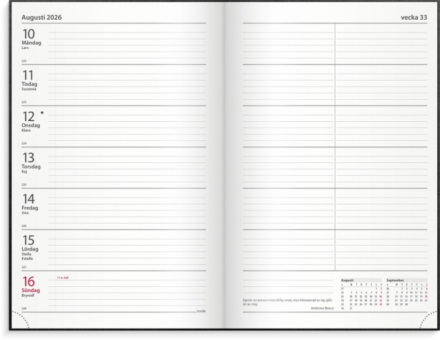 - Information Inbunden kalender med en vecka per uppslag, praktiskt märkband samt årsplaner för innevarande och följande år.? Format: 150x230 mm? Layout: Liggande. Vecka/uppslag? Kalendarium: 2025-12-22 - 2027-01-03? Omslag: Konstläder. Inbunden? Detaljer: Märkband. Innehåll: Kyrkliga helgdagar, Flaggdagar, Helgdagar/aftnar, Månfaser, Namnsdagar, Internationella helgdagar översikt, Temadagar/händelser, Årsöversikt/årsöversikter, Årsplan/årsplaner? Antal sidor: 128? FSC Mix