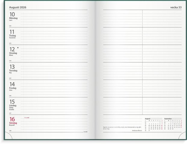 - Information Inbunden kalender med en vecka per uppslag, praktiskt märkband samt årsplaner för innevarande och följande år? Format: 150x230 mm? Layout: Liggande. Vecka/uppslag? Kalendarium: 2025-12-22 - 2027-01-03? Omslag: Kartong med struktur. Inbunden? Detaljer: Märkband? Innehåll: Kyrkliga helgdagar, Flaggdagar, Helgdagar/aftnar, Månfaser, Namnsdagar, Internationella helgdagar översikt, Temadagar/händelser, Årsöversikt/årsöversikter, Årsplan/årsplaner? Antal sidor: 128? FSC Mix