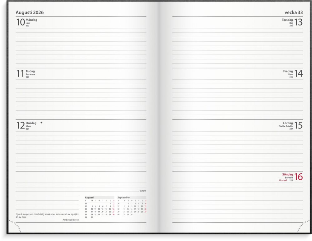 - Extra information Format: 150x230 mm. Layout: Liggande. Vecka/uppslag. Kalendarium: 2025-12-22 - 2027-01-03. Omslag: Kartong. Inbunden. Detaljer: Märkband. Innehåll: Kyrkliga helgdagar, Flaggdagar, Helgdagar/aftnar, Månfaser, Namnsdagar, Internationella helgdagar översikt, Temadagar/händelser, Årsöversikt/årsöversikter, Årsplan/årsplaner. Antal sidor: 128. Miljöinformation: FSC®.