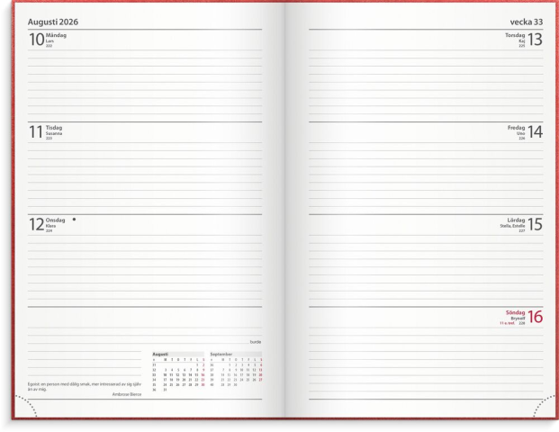 - Extra information Format: 150x230 mm. Layout: Liggande. Vecka/uppslag. Kalendarium: 2025-12-22 - 2027-01-03. Omslag: Konstläder. Inbunden. Detaljer: Märkband. Innehåll: Kyrkliga helgdagar, Flaggdagar, Helgdagar/aftnar, Månfaser, Namnsdagar, Internationella helgdagar översikt, Temadagar/händelser, Årsöversikt/årsöversikter, Årsplan/årsplaner. Antal sidor: 128. Miljöinformation: FSC®.