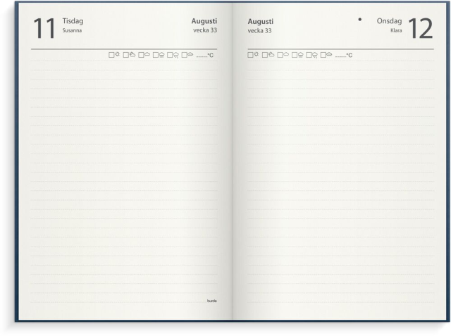 Format: 142x205 mm. Layout: Dag/sida. Kalendarium: 2026-01-01 - 2026-12-31. Omslag: Konstläder. Inbunden. Detaljer: Märkband. Innehåll: Kyrkliga helgdagar, Flaggdagar, Helgdagar/aftnar, Månfaser, Namnsdagar, Temadagar/händelser, Vädernoteringar, Årsöversikt/årsöversikter, Årsplan/årsplaner. Antal sidor: 384. - Information Cremefärgat papper. Namnsdagsregister och plats för vädernoteringar.? Format: 142x205 mm? Layout: Dag/sida? Kalendarium: 2026-01-01 - 2026-12-31? Omslag: Konstläder. Inbunden? Detaljer: Märkband? Innehåll: Kyrkliga helgdagar, Flaggdagar, Helgdagar/aftnar, Månfaser, Namnsdagar, Temadagar/händelser, Vädernoteringar, Årsöversikt/årsöversikter, Årsplan/årsplaner? Antal sidor: 384