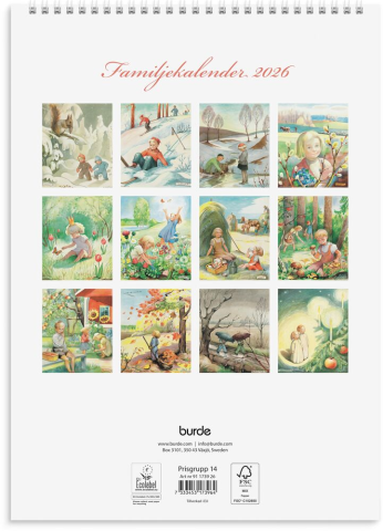 FamiljeFormat: A4. Layout: Månad/blad. Kalendarium: 2026-01-01 - 2026-12-31. Spiralbunden. Innehåll: 4 kolumner, Flaggdagar, Helgdagar/aftnar, Månfaser, Namnsdagar, Temadagar/händelser. Antal sidor: 12. Miljöinformation: FSC®. Ecolabel. - Information Följ årets månader med de vackra, klassiska motiven som är illustrerade av Kerstin Frykstrand. Familjekalender med 4 kolumner som underlättar planeringen.