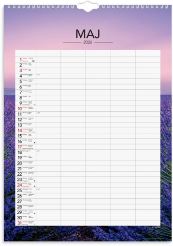 FamiljeFormat: A3. Layout: Månad/blad. Kalendarium: 2026-01-01 - 2026-12-31. Spiralbunden. Innehåll: 5 kolumner, Flaggdagar, Helgdagar/aftnar, Månfaser, Namnsdagar, Temadagar/händelser, Årsöversikt/årsöversikter, Årsplan/årsplaner. Antal sidor: 12. Miljöinformation: FSC®. - Information Gym, ledighet och barnens viktiga saker? Håll ordning på familjeplaneringen och alla aktiviteter i en familjekalender. Med fem kolumner finns plats till alla.