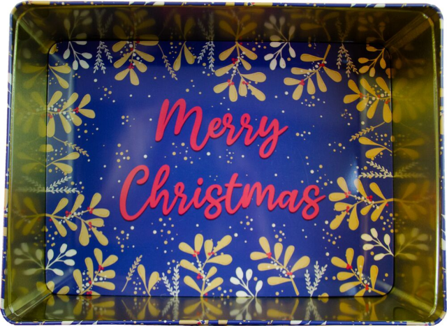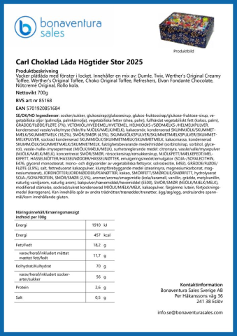 - Information Julig dekorativ plåtlåda med ett fönster som visar det goda innehållet. När det goda tar slut finns där en trevlig julhälsning i botten. Innehåller: Dumle, - Twix, - Werther?s Original Creamy Toffee, - Werther?s Original Toffee, - Choko Original Toffee, - Refreshers, - Elvan Fondanté Chocolate, - Nötcremé Original, - Rollo kola.