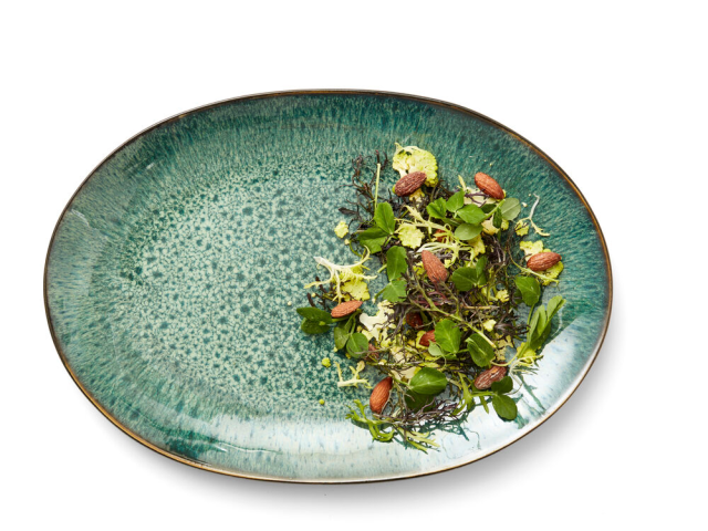 BITZ ovalt fat i svart stengods med matt reaktiv glasyr på utsidan kombinerat med en fin blank grön glasyr på insidan. Fatet är imponerande vackert till sallader och anrättningar. Fatet mäter 36 x 25 cm. Lämpligt till maskindisk. Du kommer aldrig att bli trött på att se på den vackra kombinationen av den matta utsidan och den strålande, blanka insidan. Den matta, reaktiva glasyren gör faten och alla de övriga produkterna i Christian Bitz? stengodsserie unika. Man kan se olika repor, märken och mönster i glasyren, och inga produkter är precis likadana. Detsamma gäller insidans blanka färgade glasyr.