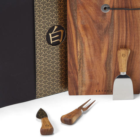 Satake Shiro ostset har en liten läcker skärbräda i akacia som är 17x25 cm med en mockarem för upphängning. Skärbrädan kommer i ett set med tre ost- & charkredskap. En kniv, en spatel och en gaffel i rostfritt stål med snyggt designade skaft av akaciaträ. Bladlängd 7 cm och skaftlängd 7 cm. Perfekta gåvan till livsnjutaren som inte bara vill servera goda ostar, chark och snacks utan som också vill göra det med klass och stil!