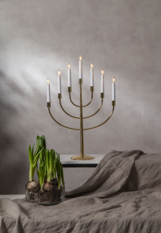- Information En eleganta metalljusstake i mässingsfärg. 7 LED-ljus med soft glow. Sprider ett härligt ljus och skapar julstämning. Höjd 59 cm, bredd 38 cm.