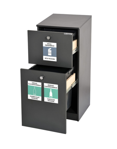- Information Ett modulsystem för avfallshantering och källsortering. Innehåller två backar i lådorna på 22 och 29 Liter. Mått H x B x D: 1000 x 430 x 440 mm.
